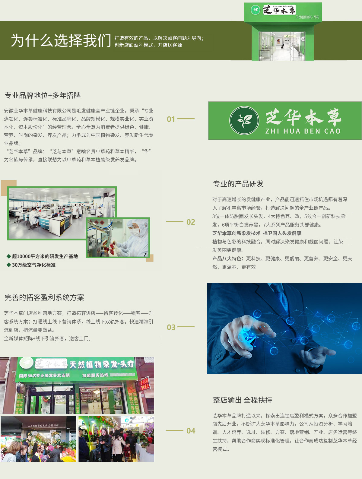 品牌介紹 安徽芝華本草健康科技有限公司是毛發健康全產業鏈企業,秉承“專業連鎖化、連鎖標準化、標準品牌化、品牌規?;?、規模實業化、實業資本化、資本股份化”的經營理念,全心全意為消費者提供綠色、健康、營養、時尚的染發、養發產品;力爭成為中國植物染發、養發新生代專業品牌。 “芝華本草”品牌:“芝與本草”意喻名貴中草藥和草本精華,“華”為名族與傳承,直接聯想為以中草藥和草本植物染發養發品牌。 經營理念 精...